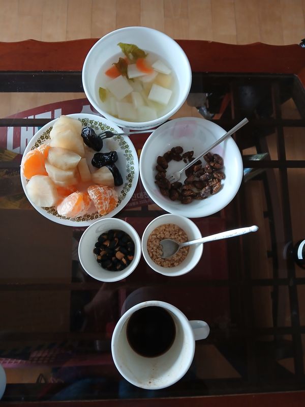 이계호교수 레시피 응용 물김치(저염: 유산균, 익은 야채) 야콘 귤 건자두 번데기 서리태볶음, 현미 발아해서 덖은 현미쌀 한줌 그리고 6시간 달인 대추 생강차(달지 않다. 꿀이나 올리고당 넣을까 하다가 잣 몇개 띄우다) 야채 과일은 2인용, 다행스럽게도 우린 과일을 좋아하지 않는다. 감기 기운이 있어 모처럼 귤 하나 깠다. 간헐적 단식14h,탄수화물 줄이기!