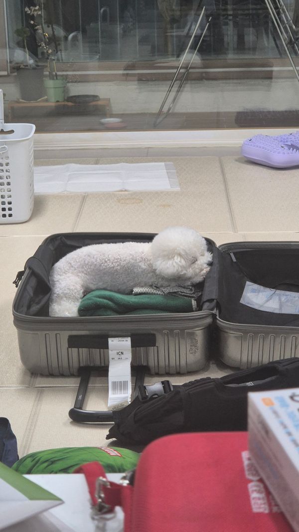 반려견 두마리 캐어했어요 작년 처음 만났을 때는 옆집민원을 부를 정도로 싸웠는데 자주보더니 이제 가족으로 인지하는 듯~~~ 때로는 다정하게 사진폼도 주지만 어느순간 삼수니를 탁자밑으로 쫓아버리는 멜로니는 캐리어로 들어가 벌러덩~~ 엄마 나도 델쿠가~~~시위했대요 ㅎㅎ 집으로 온 삼수니는 기절~~~