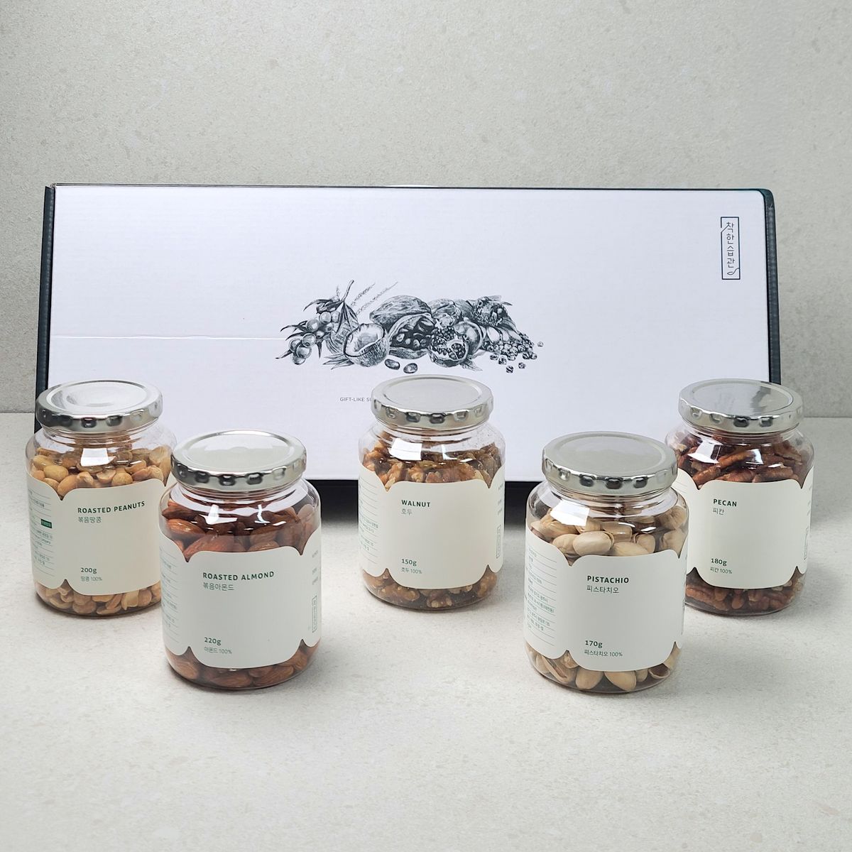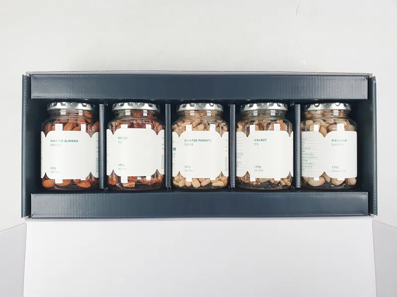볶음땅콩, 볶음아몬드, 호두, 생 캐슈넛, 피칸으로 구성되어 있습니다.