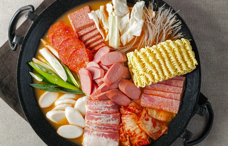 햄, 소시지, 채소가 푸짐하게 들어 있어 반찬 없이도 든든한 한끼 완성이에요. 국물이 칼칼하고 육수의 맛이 진해서 라면사리나 밥을 말아 먹기 좋습니다.