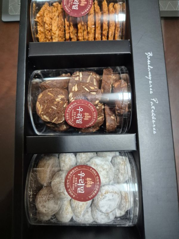 선물용으로 구매한거라 박스 개봉안했어요. 쿠키가 아주 맛있고 적당히 달고 바삭바삭한게 넘 맛있어요. 자주 구매하는 상품인데 당골고객에겐 서비스로 아주 작은 쿠키한개라도 넣어주셨음 더 검동적일건데~^^