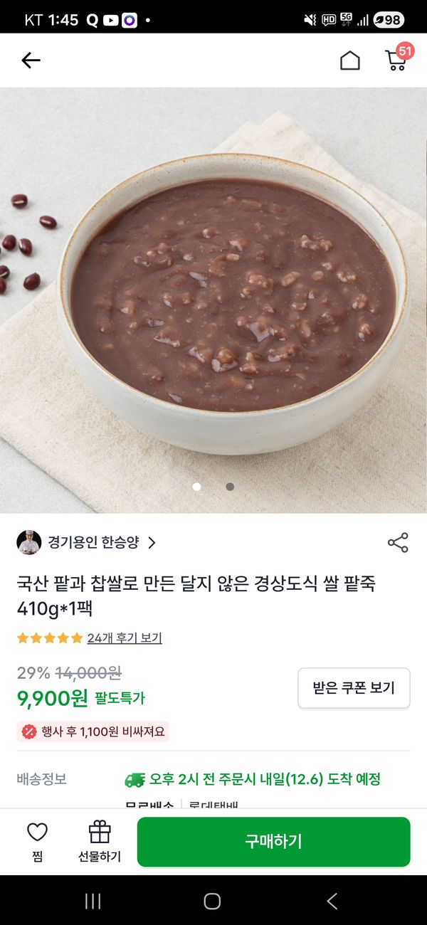 옵션: [25/11/19 수령] 경상도식 쌀 팥죽 410g*5팩