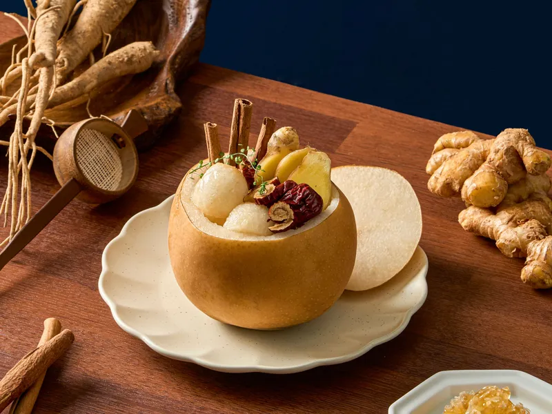 배숙은 예로부터 조선 왕실에서 전해 내려오는 음식으로, 배의 속을 파내어 생강, 대추, 꿀, 도라지를 넣고 쪄낸 전통 보양식입니다. 주로 기관지에 도움을 주는 원료들로 구성되어 있죠.