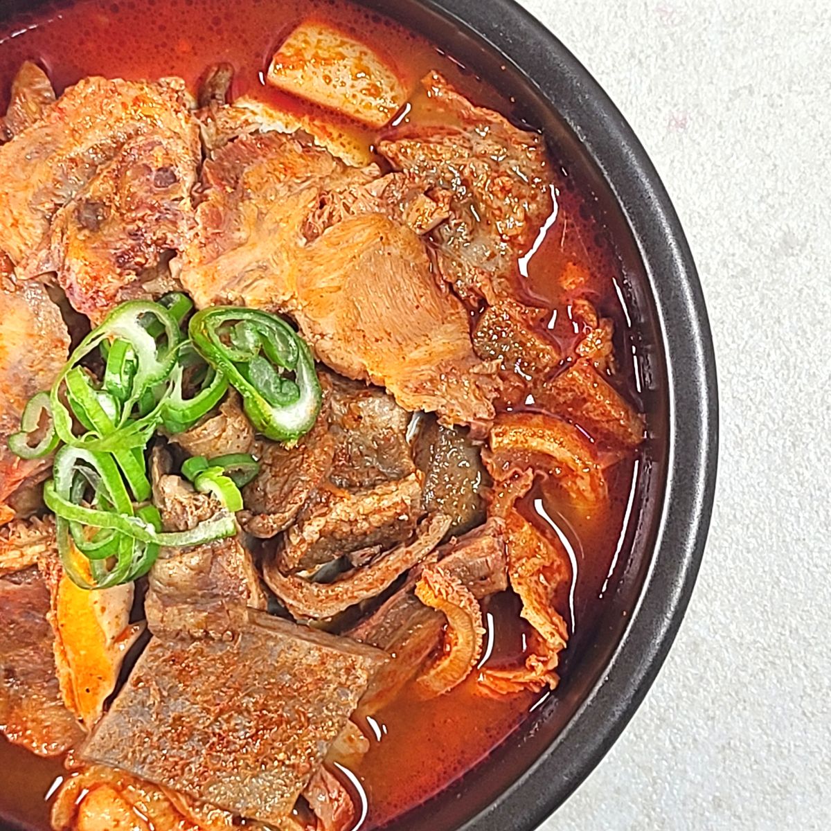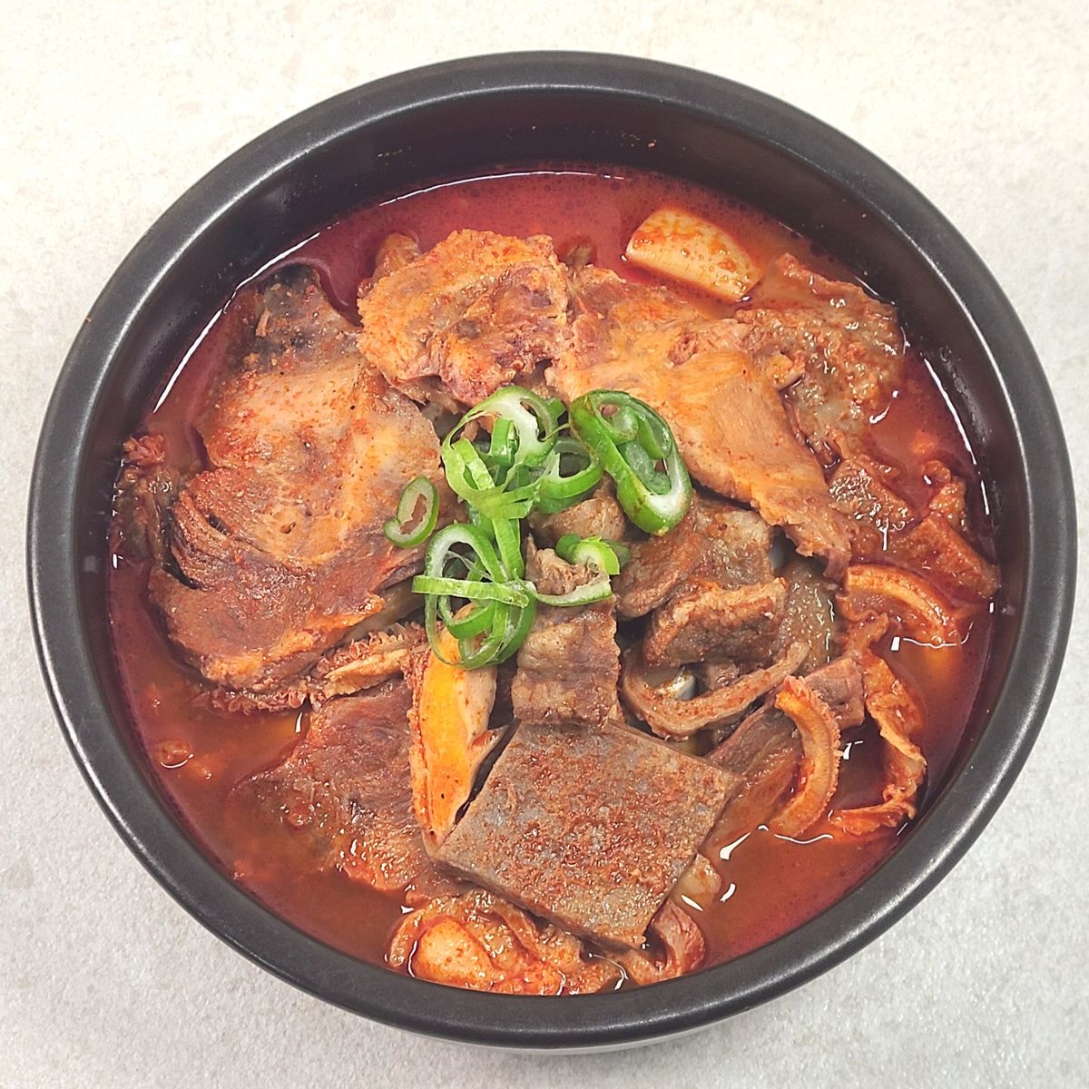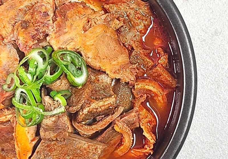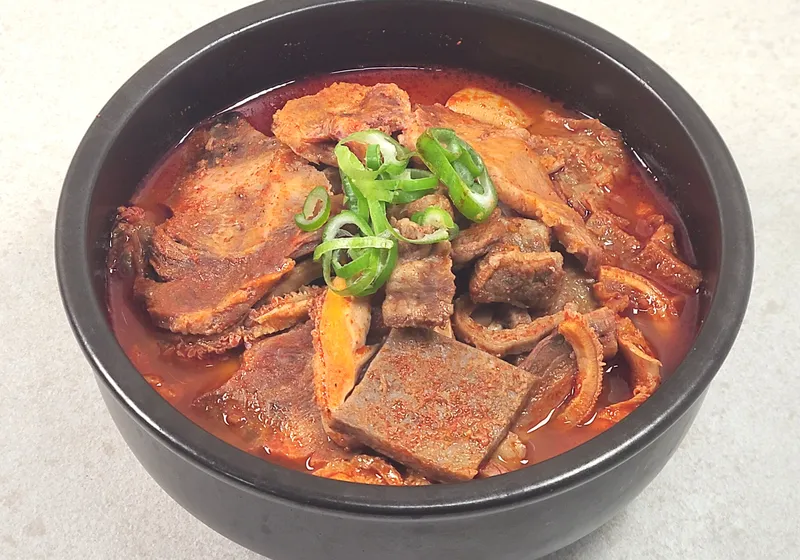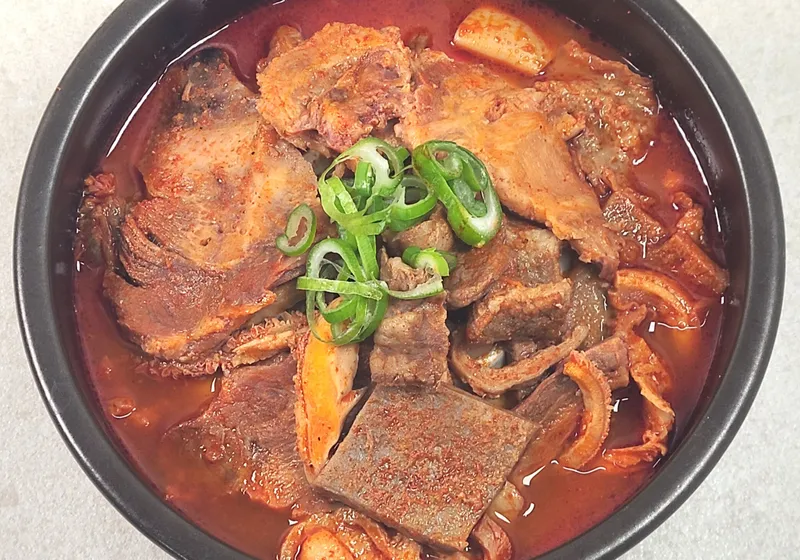 쫄깃하면서도 부드러운 식감이 특징이에요. 질기지 않은 내장과 소고기가 고추기름으로 칼칼하고 살짝 매콤하게 양념되어 있어서 속풀이와 해장용으로 딱 맞아요. 한국인의 입맛에 맞춘 얼큰하고 개운한 맛이 일품이죠.