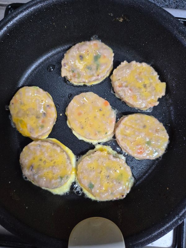 해물 동그랑땡 계란풀어서 후라이팬에 올리브오일 두루고 부침으로 해서 먹으니 식구들이 맛있다고 잘먹네요