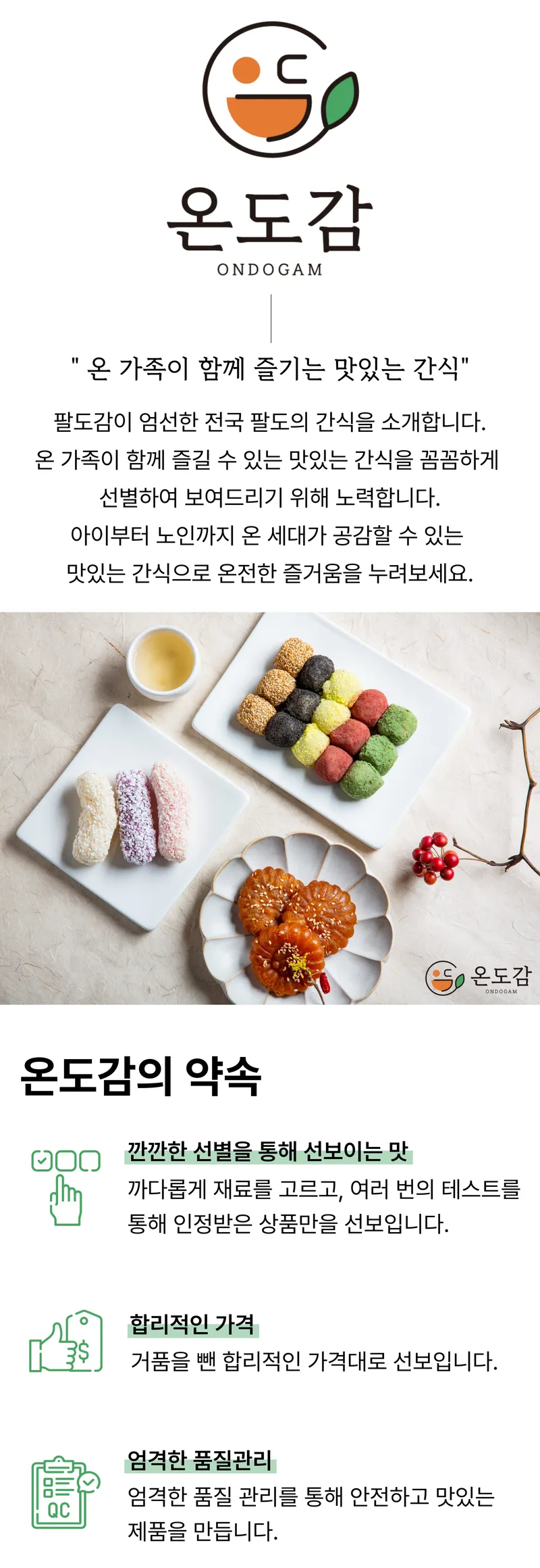 온 가족이 즐기는 전국팔도의 맛있는 간식, 온도감입니다. 온도감은 온가족이 공감하며 먹을 수 있는 간식을 꼼꼼하게 엄선하여 보내드리는 팔도감의 브랜드입니다. 온 세대가 함께 즐길 수 있는 맛있는 간식으로 즐겨움을 누려보세요!