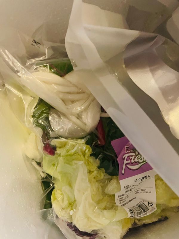 진공팩으로 포장되어 전제적으로 신선해요. 5가지 야채가 골고루 섞여있지않고 야채 순서대로 차곡차곡 넣었어요. 그래서 제일 빨리 물려지는 채썬양파랑 안 섞여져 있어서 그나마 괜찮네요. 상대적으로 양상추만 많아서 아쉬워요.