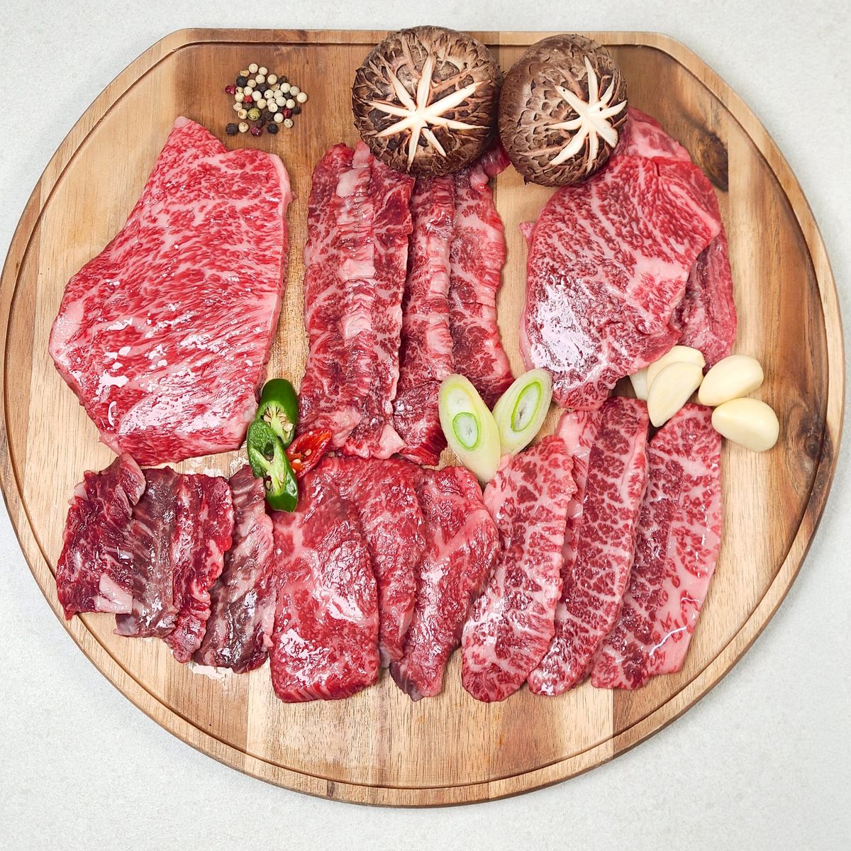 옵션: 1++ 8~9 등급 미경산 암소한우 우마카세 700g(꽃등심 100g/채끝 100g/갈비살 100g/부채살 100g/ 업진살 100g/ 삼각살 200g)