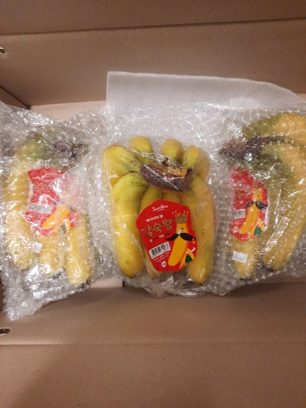 아직후숙이안되서밖에두고노랗게변하길기다리고있네요바나나는튼실하니맛있게보이네요.먹고맛좋으면재구매입니다
