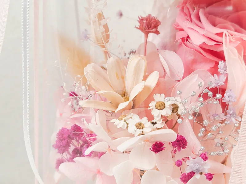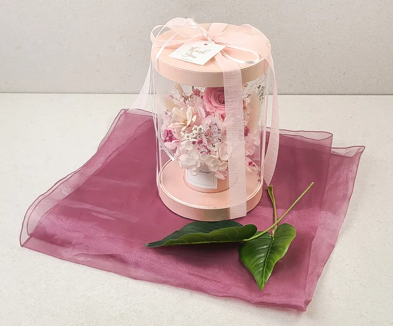 투명 원형 박스와 핑크빛 리본으로 아름답게 포장했습니다. 프리저브드 센터피스 원형 박스만 있다면 특별한 날 고마운 마을을 전하기 충분해요😊