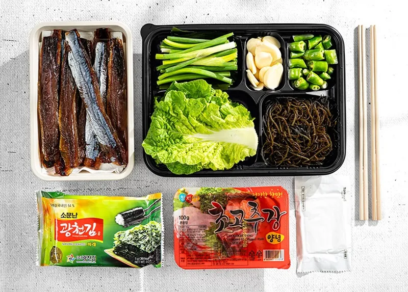 과메기 10미(20쪽), 쪽파, 마늘, 고추,조미김, 고추장, 나무젓가락 2개, 물티슈