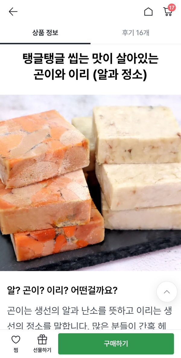 알+곤이 구매했는데 2가지다알이네요 봉지에는 알 곤이라고적혀있는데 난 곤이가좋은데 두가지다알이라니 개실망