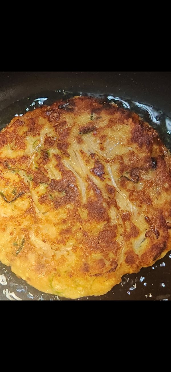 녹두전이 두툼해서 약한 불에 기름 넉넉히 두르고 뚜껑 덮어 구웠더니 겉바속촉 맛있습니다 .