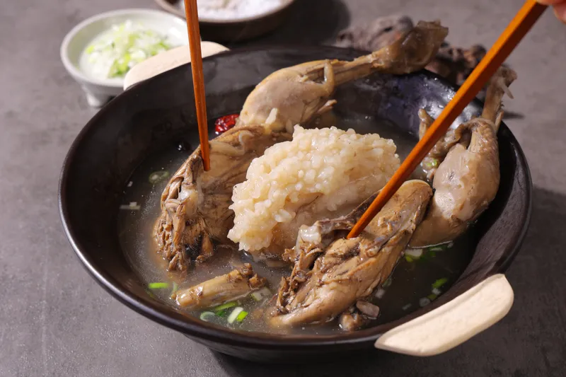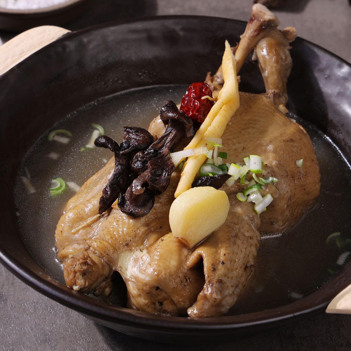 삼계탕 전문점의 특별 레시피로 갖가지 재료를 넣어 푹 끓인 깊은 맛의 능이삼계탕입니다. 국내산 생닭부터 능이버섯, 황기, 당귀, 인삼, 뽕나무 등 다양한 재료가 들어가 잡내 없이 더 진한 국물 맛을 표현했죠. 능이버섯이 들어가 은은한 맛과 향까지 더했답니다.