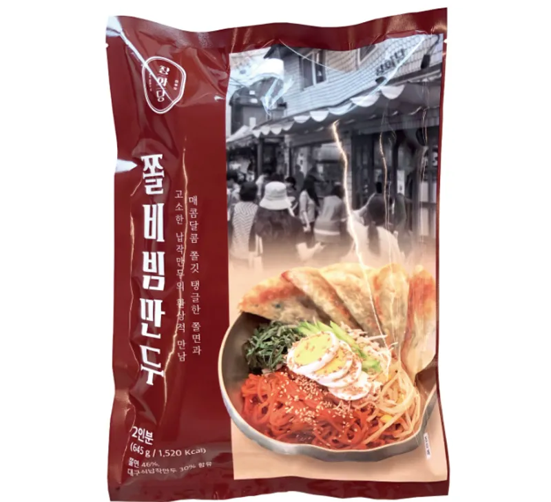 잘 달궈진 프라이팬에 식용유를 두른 후 냉동상태의 대구식 납작만두를 넣고 노릇노릇해지도록 구운 후 쫄면과 함께 드세요.