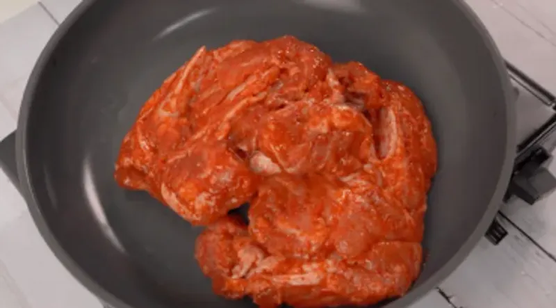 1. 넓은 팩이나 큰 웍에 춘천 닭갈비를 꺼내어 중불에 타지 않게 볶아주세요. (물이나 기름은 넣지 마세요.)