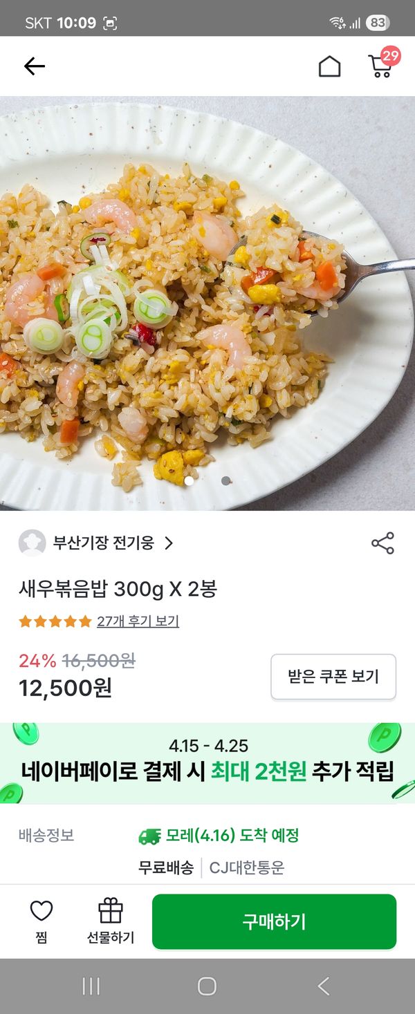 맛있는 새우볶음밥을 간편하게 먹을수 있어 좋았구요. 냉동이지만 아주 맛있었어요. 탱글한 새우 식감도 좋았습니다