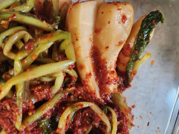 아버진 잎이 늙어 약간 질기다 하시는데 양념이랑은 맛있다 인정하셨어요. 전 질김도 잘 모르고 먹었고요, 마트 종가집 무김치보다 10배는 맛있구요, 익으니까 더 맛있네요~(사진찍는걸 깜박;;)