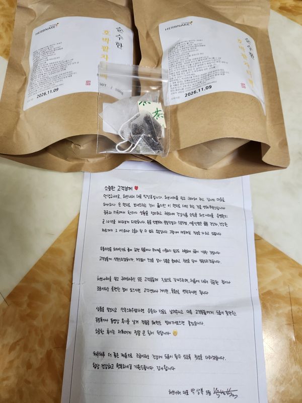 저는 배달음식도 리뷰를 쓰지 않는 편입니다. 좋으면 재주문하면되고 싫으면 다시 먹지 않으면 되니까요. 커피중독이라 몸에 건강한 차를 마시고 싶어 고민중에 이용하게 됐습니다.녹차류는 속이 쓰리고 꽃차는 선호하지 않으며 익숙하지 않은 것들을 도전하지 않는데 호박팥차는 친숙하고 지금 제가 젤 원하는 차인것 같아요. 자극적인 것에 익숙해 차가 밍밍할까봐 두개의 티백을 우렸는데 생각보다 진해서 내일부터는 한 개만 우려먹어도 될 것 같습니다. 정성스럽게 만들어진 차와 판매자의 성의가 느껴져서 리뷰를 남겨봅니다.꾸준하게 잘 마셔볼게요.