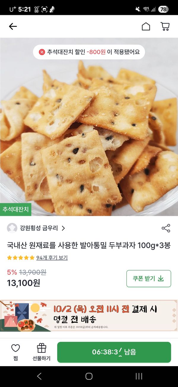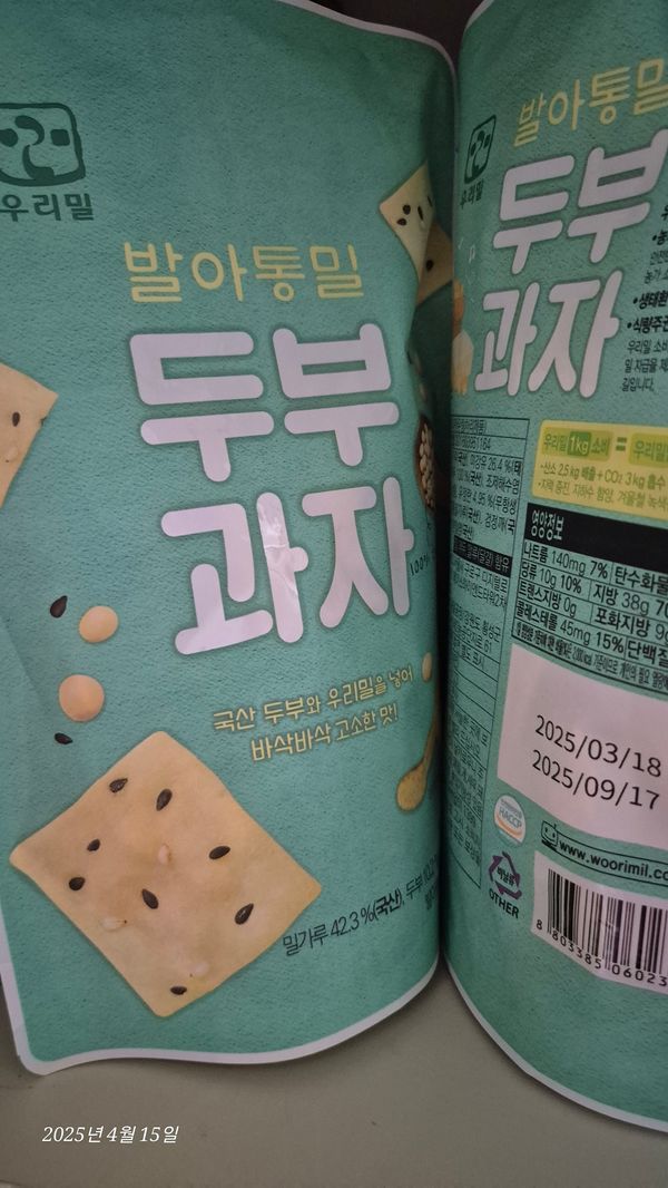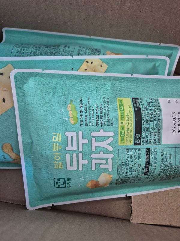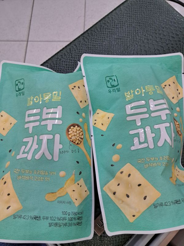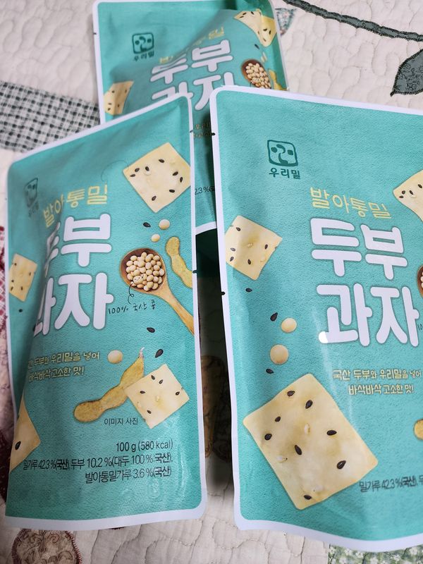 재구매입니다. 팔도감에서 판매중인 두부과자 중 원재료가 제일 깔끔합니다. 다른 판매처 제품은 시식을 못해서 맛 비교는 불가하나, 본 판매처 제품은 그닥 딱딱하지 않고 '아삭바삭' 하단 표현이 적당하다 싶어요. 달콤, 고소해서 한봉 뜯으면 거의 다 먹을 판이지만, 칼로리 고려해서 반만 먹고있어요~ 봉 당 100그람 단위인데 타처 50그람 보다 단가는 더 저렴한 것 같고요~