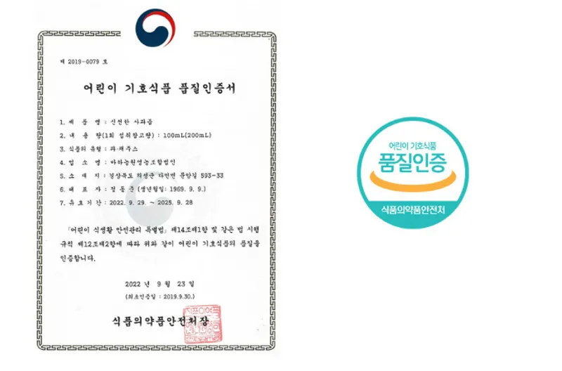 저희 사과즙은 아이들에게 유해한 성분은 넣지 않고 영양소를 고루 갖춘 식품에 부여되는 '어린이 기호식품 품질 인증'을 획득한 사과즙입니다. 소중한 내 아이에게 먹이는 사과즙, 까다롭게 선택하세요!