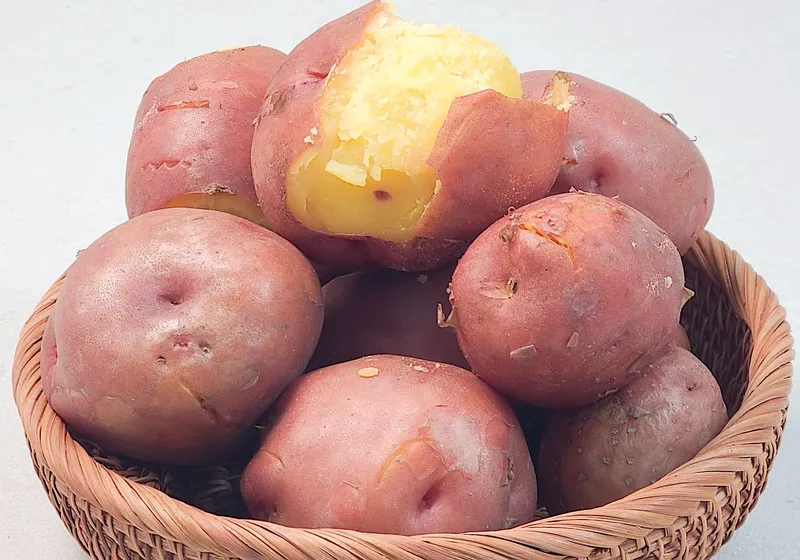 홍감자는 겉은 붉고 속은 노란 특별한 외관을 가진 감자예요. 포슬포슬하고 부드러워 카스테라 같은 식감이 특징입니다. 달콤한 맛으로 입안에서 사르르 녹아 자꾸만 손이 가는 맛있는 감자예요.