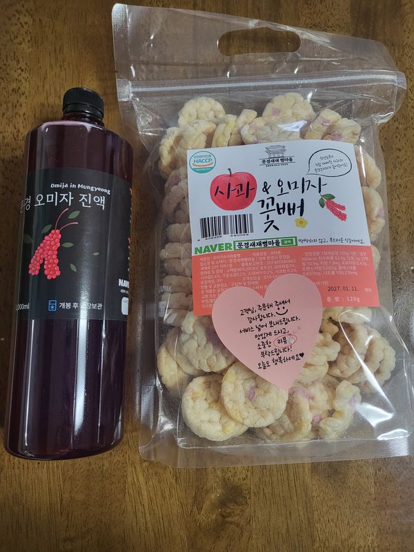 오미자차 너무 맛있어요. 혹시몰라 한병 구매 했었는데 아쉽네요. ㅎㅎ 뻥튀기도 같이 주셨는데 너무 맛있게 잘 먹었어요.^^