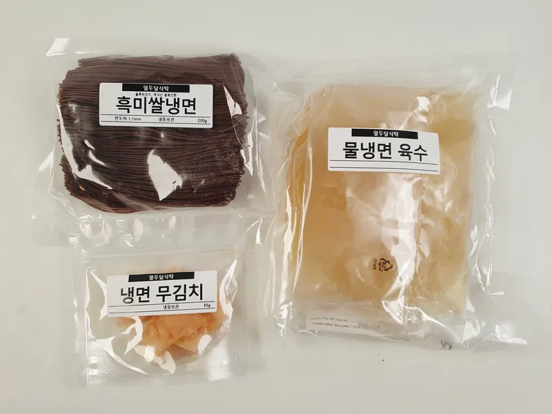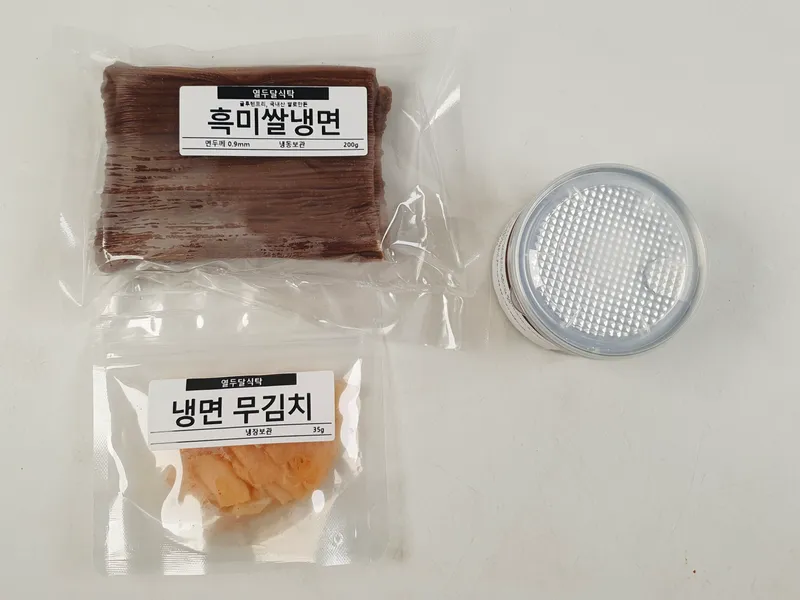 면 200g, 냉면육수 350g, 절임무 35g으로 구성되어 있습니다.
