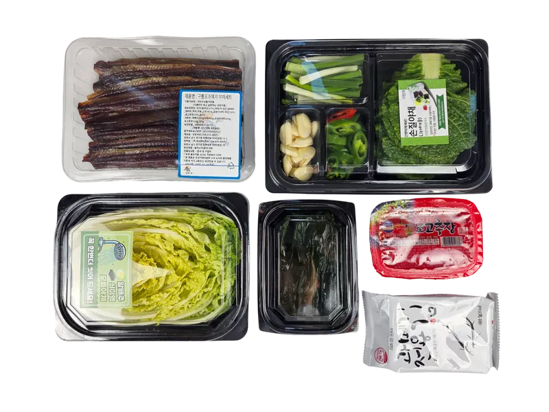 *(꽁치 과메기 220g 14쪽 내외) 모둠 야채 (380g) 알배추, 쌈 배추, 쪽파, 마늘, 고추, 물미역(100g), 초고추장 100g, 김 5g