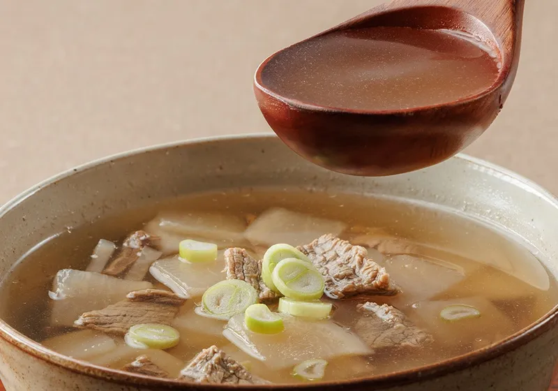 정성스럽게 우려낸 소고기 육수와 아삭한 무가 만나 깊은 맛을 선사해요. 진하면서도 담백한 국물 맛이 입안 가득 퍼져 식사의 품격을 높여줘요! 고소한 소고기 육수에 칼칼한 맛이 더해져 더욱 깊은 풍미를 느낄 수 있답니다.