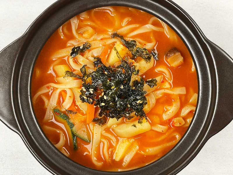 오래 반죽해 쫄깃하고 부드러운 식감의 생칼국수면입니다.언제 드셔도 탱글탱글한 칼국수를 즐기실 수 있어요. 육수의 양념이 깊게 배어들어 밀가루 풋내는 전혀 나지 않아요!