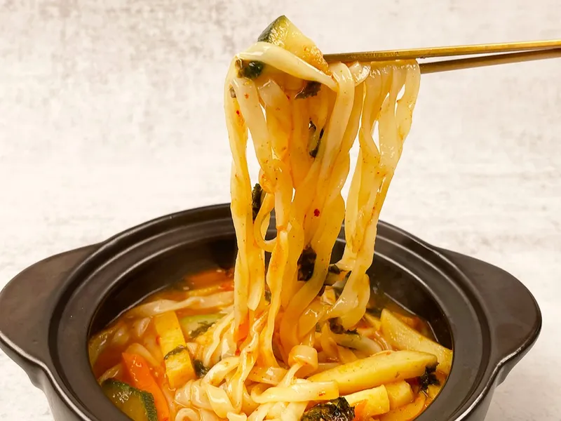 2. 양념장, 채소, 칼국수를 모두 넣고 중불에 5분 간 푹 끓여주세요. 밀가루 냄새에 예민하시거나, 더 깔끔하게 드시고 싶으신 분들은 면을 따로 끓여주세요!