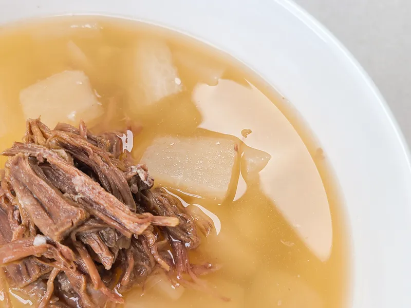 깔끔하고 맑은 국물 맛 좋은 소고기뭇국입니다. 부드러운 소고기와 품질 좋은 달큼한 국내산 무를 숭덩 숭덩 썰어 넣어 만들었어요.