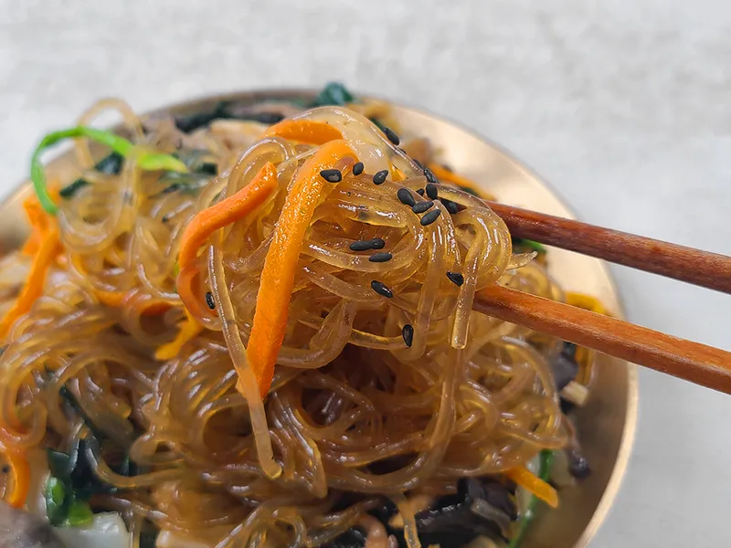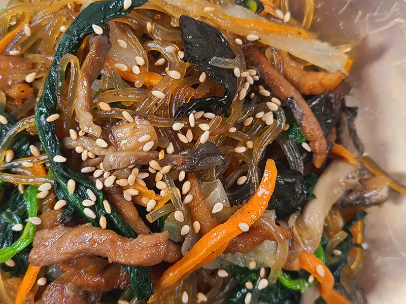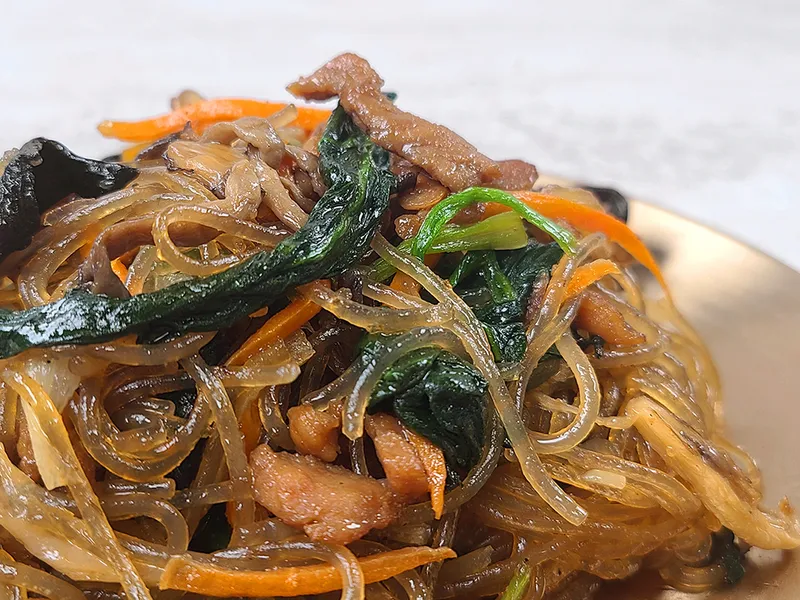 탱글탱글한 당면과 함께 시금치, 당근 등 싱싱한 재료만을 사용했습니다. 다양한 채소들이 모여 풍부한 맛과 식감을 만들어내요. 국산 돼지고기의 쫄깃함도 일품이랍니다. 짭조름한 간장으로 볶아 감칠맛 좋아요.