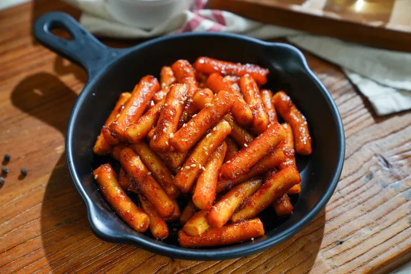 2. 달궈진 팬에 물기를 제거한 떡을 넣어 노릇노릇해질 때까지 볶아주세요.