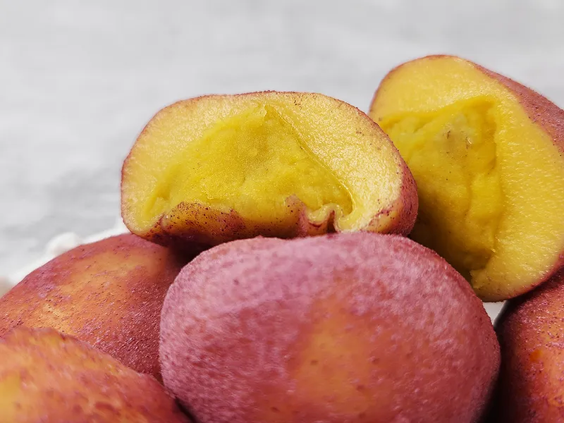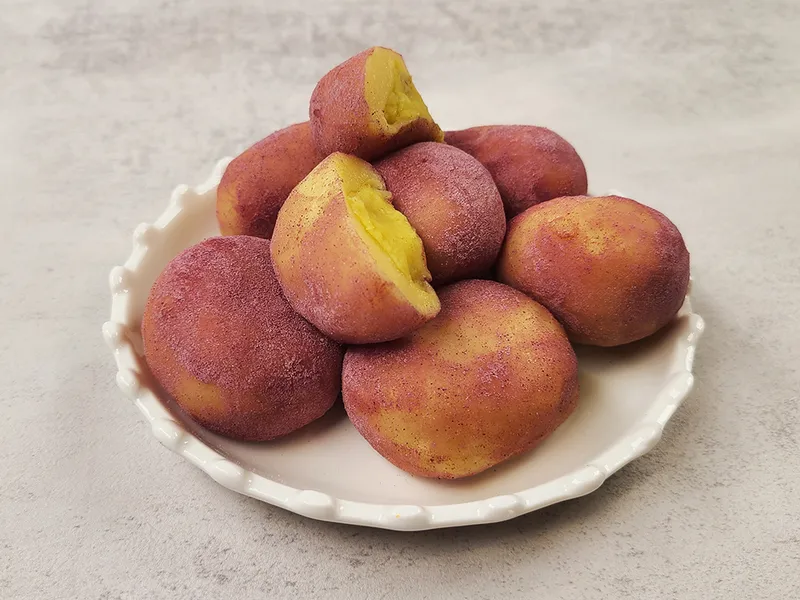 단호박으로 노란 빛깔로 색을 낸 쫀득한 떡에 앙금으로 찐 고구마를 가득 채웠어요. 알맞게 쪄서 부드러운 식감과 입안 가득 퍼지는 고구마 맛이 일품입니다. 그리고 자색 고구마 가루를 오븐에 구워 깊은 향까지 챙겼습니다.