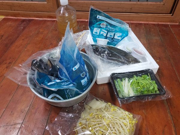 바지락봉지와 아이스팩이 터져서 물에 잠겨있었지만 재료는 신선한 것 같네요 맛있게 잘 먹을께요
