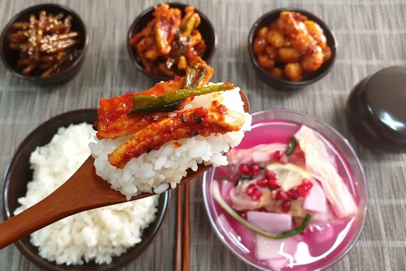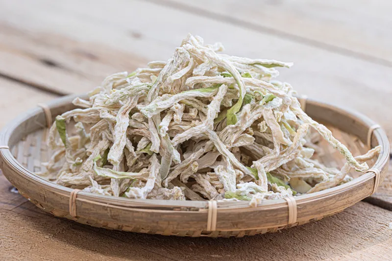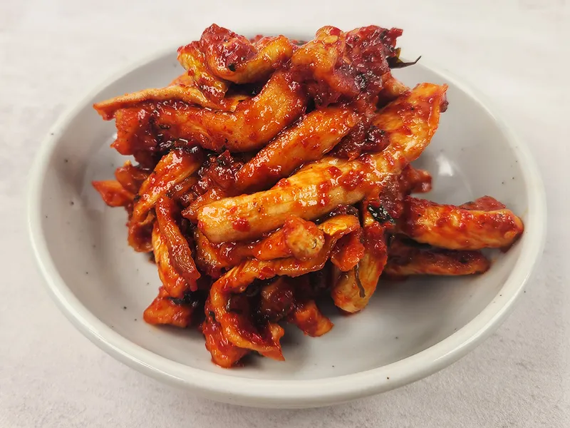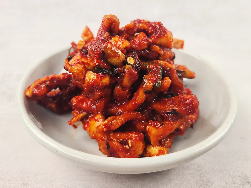 직접 재배한 국산 무를 바짝 건조한 다음, 경상도식 김칫소에 듬뿍 버무렸어요. 달큰하면서 꼬들꼬들한 식감으로 밥반찬으로 제격이에요.