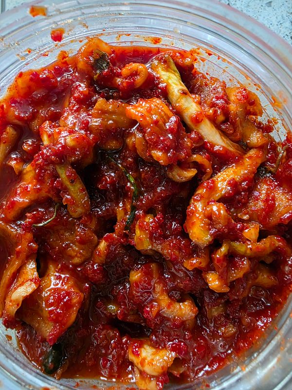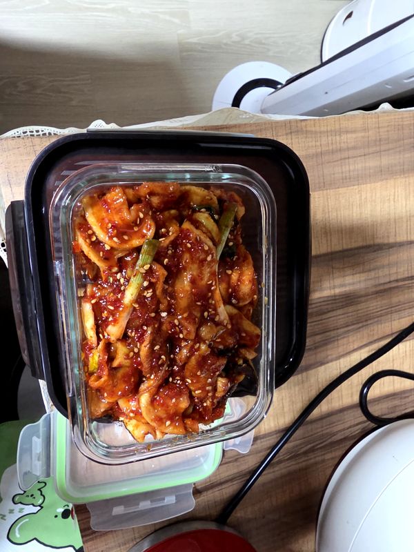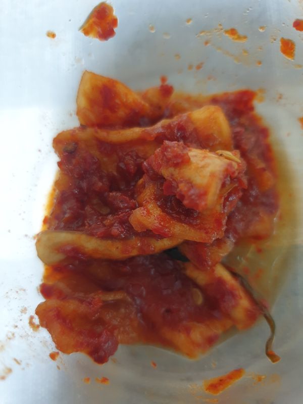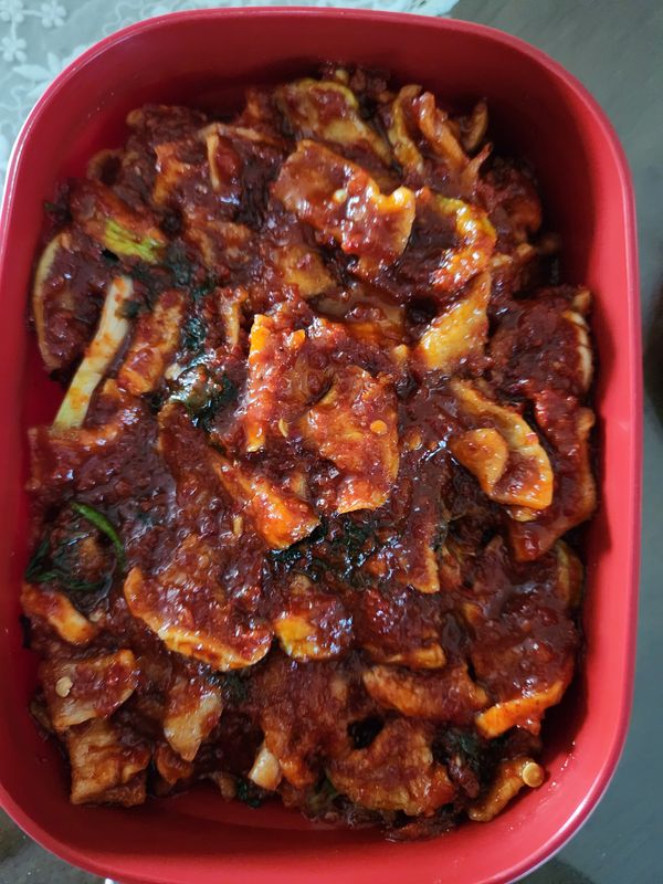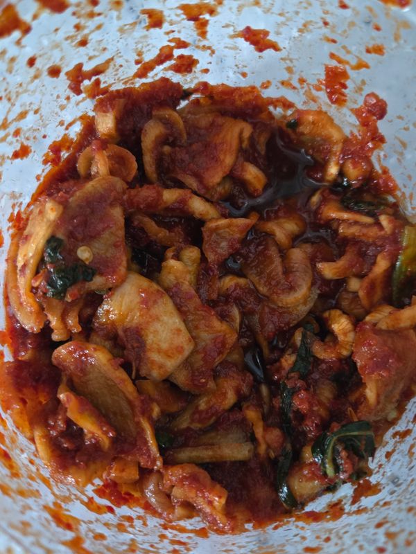 시중에 파는 들쩍지근한 맛 아니고 맛있게 버무린 가정식 맛이예요. 단지 시간이 지나니 양념이 적은 듯 해서 조금 양념 추가해서 촉촉하게 했어요