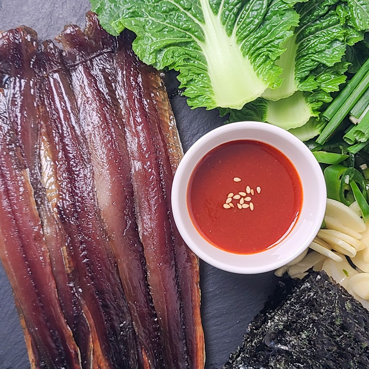 쫄깃하면서도 부드러운 육질의 과메기는 미묘한 짭짤함으로 입안 가득 풍미를 채워줍니다. 과메기와 곁들여 먹을 수 있는 구성도 모자라지 않게 준비해서 술안주로 최고예요.
