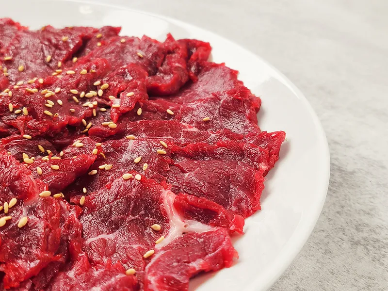 덩어리로 발송된 육사시미(뭉티기)제품은 키친타월로 핏물을 살짝 제거 후 결 반대로 썰어 주시면 질기지 않고 쫀득한 식감을 풍부하게 느끼실 수 있습니다.