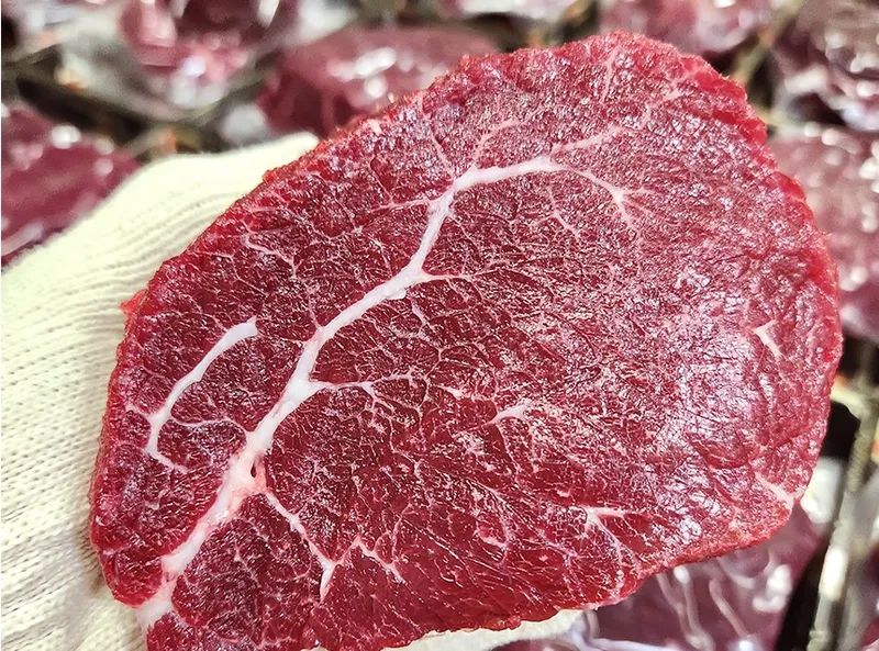 저희 뭉티기는 수많은 소고기 중 최상급으로만 직접 선별하여 가장 품질이 좋은 한우 암소임을 자부할 수 있습니다. 배송 시에 썰어져 있지 않으니, 썰어서 섭취를 권장해 드려요.