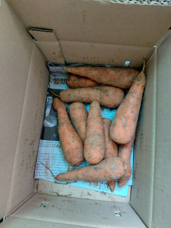 당근에 묻어있는 흙이 검고 고은흙인게 제주산인지 모르겠네요 살짝 쉰내가 나던데~~ 맛은 아삭하니 괜찮은데~~