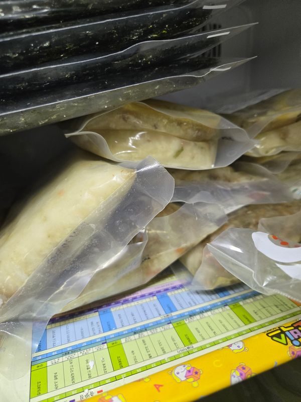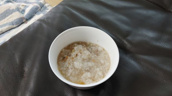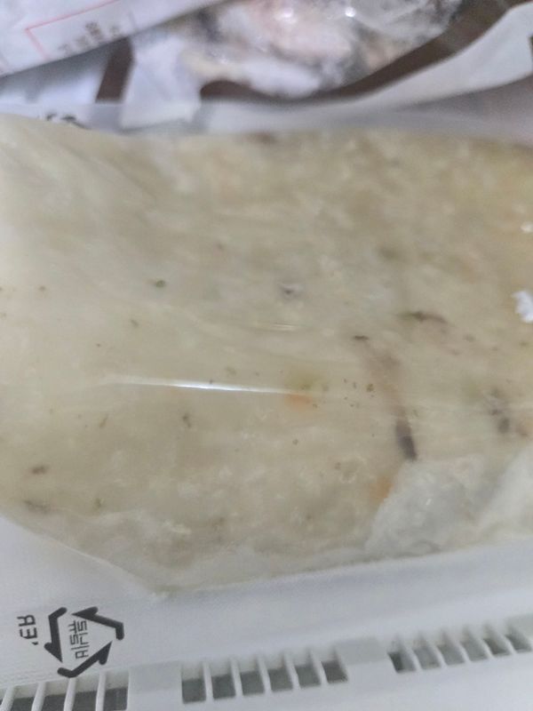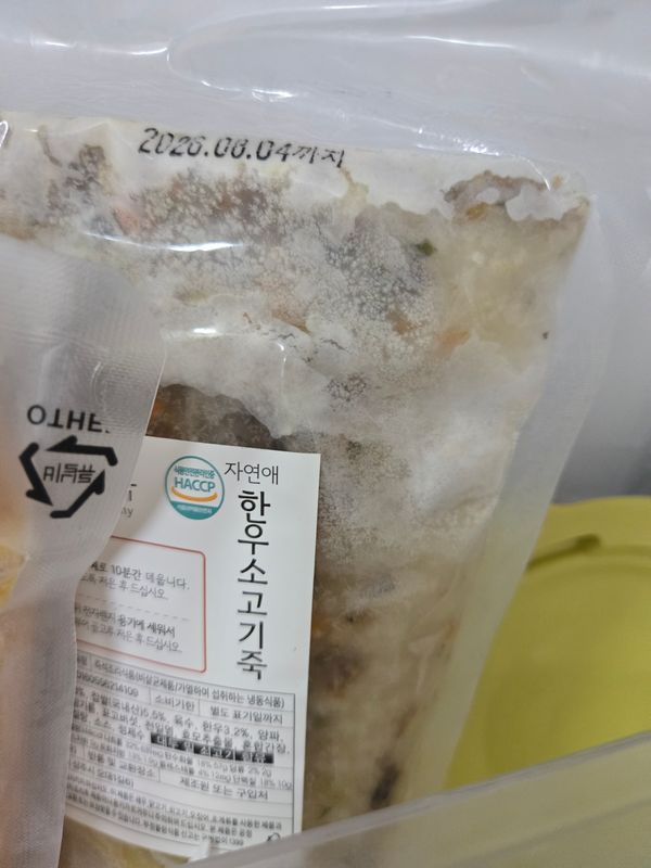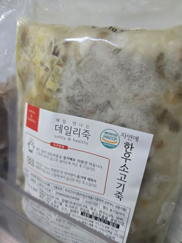 멀건 죽이 아녀서 좋아보이네요. 멥쌀 보다는 찹쌀죽 느낌. 야채, 고기 다짐 정도도 좋구요 간도 짜지않아 좋아요. 다만 죽을 나눠야할 땐 용기에 붓고 잘 섞어서 나눠야하는게 약간 아쉽네요..
