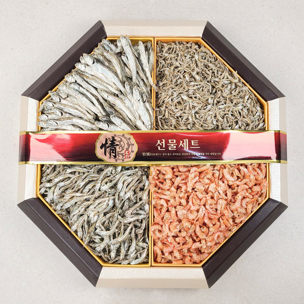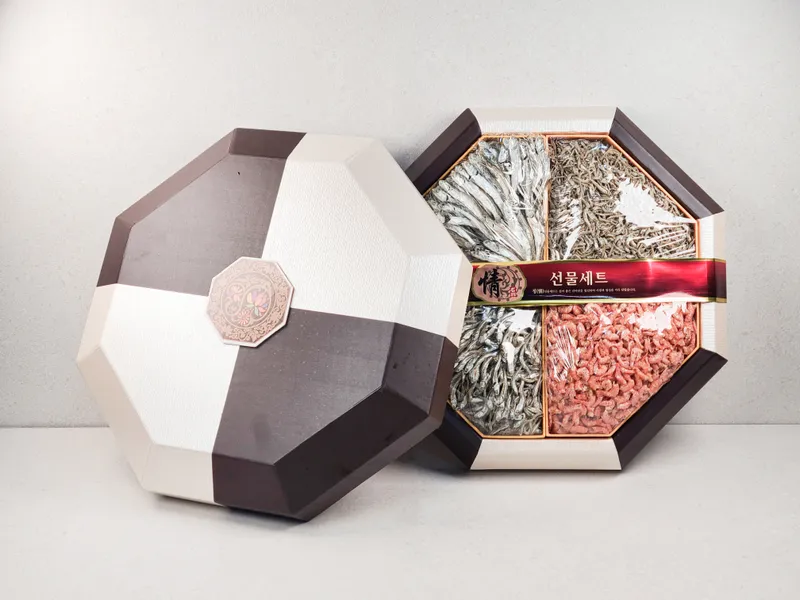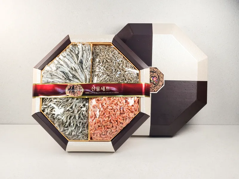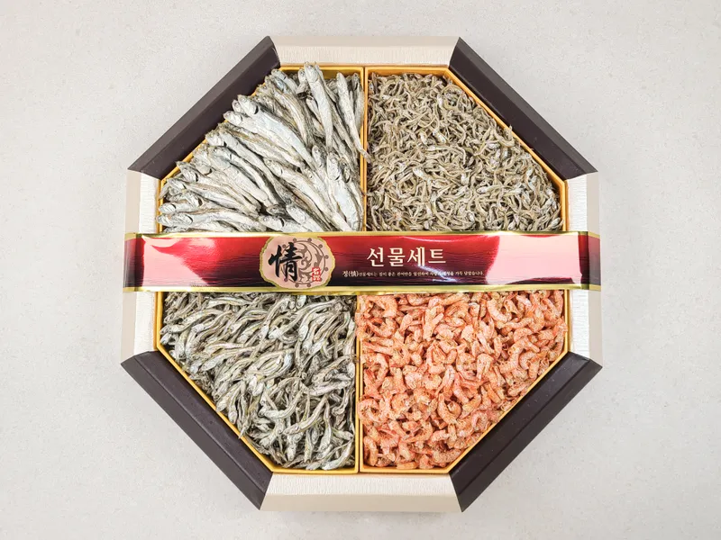 국내산 고바, 세멸, 자멸, 건새우를 더 고급스럽게 선물해 보세요! 품질 좋은 국내산 멸치와 건새우를 품격 있는 팔각함에 담아 준비했습니다. 각 크기별로 골고루 구성하여 합리적인 가격에 고품질 건어물을 선물할 수 있습니다.