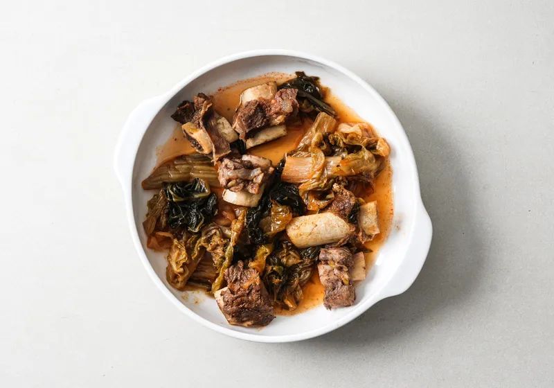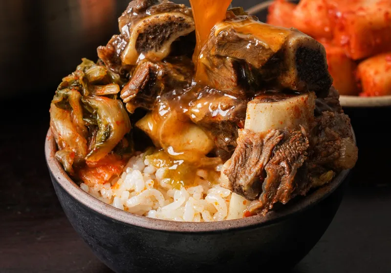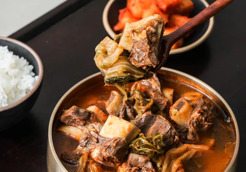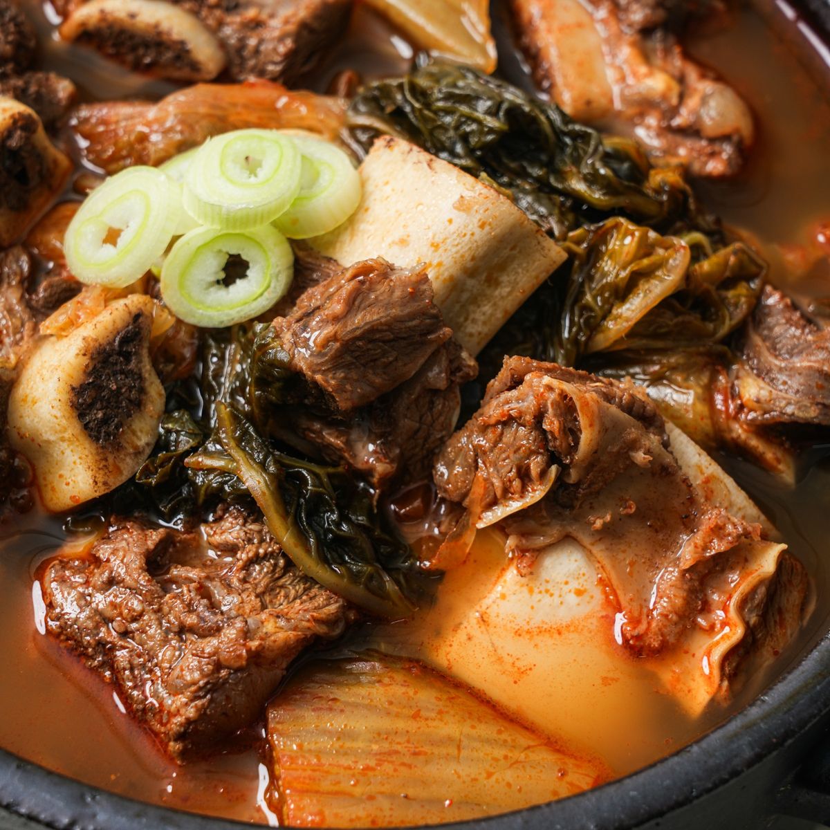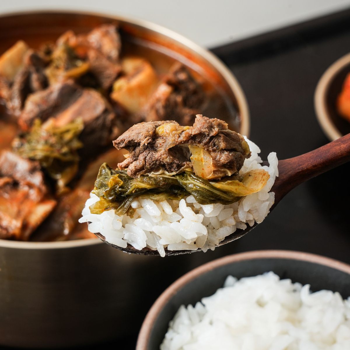 깊은 소뼈 육수에 매콤한 고춧가루를 더해 칼칼하고 풍부한 맛을 완성했어요. 부드러운 소갈비 육질과 식감 좋은 국산 배추 우거지가 어우러져 진한 풍미를 선사합니다.