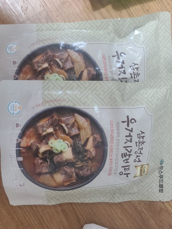 냉동으로 올 줄 알았는데 실온보관 팩으로 오네요 마트에 파는 레토르트식품 이예요 그래서 응??했는데 막상 뜯어서 보니 내용물이 애법 들어있어서 괜찮네 싶어요 뼈에 고기도 붙어있고 국물맛도 괜찮더라구요 소문난 갈비탕 집 맛은 아니지만 그냥저냥 평타하는 맛입니다