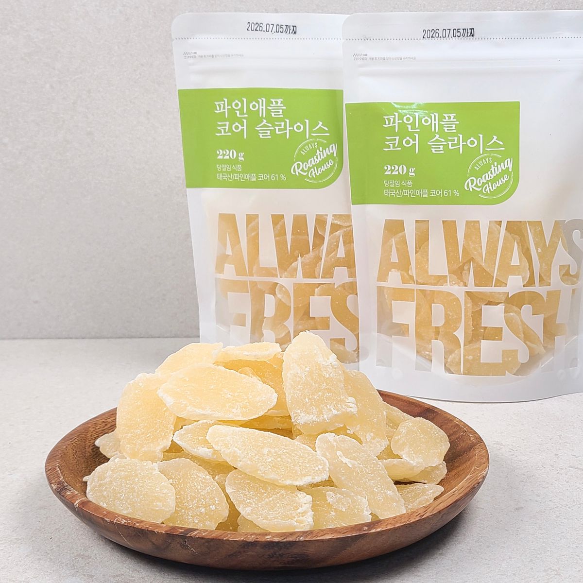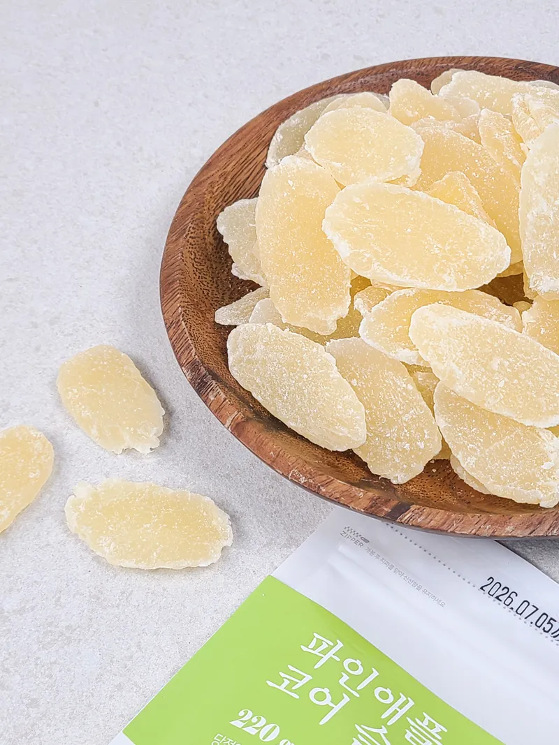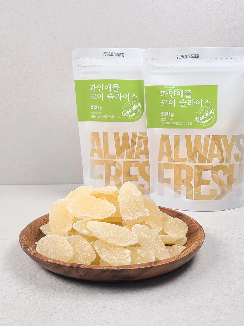 태국산 파인애플을 건조한 뒤 달콤하게 절여 만든 파인애플 코어 슬라이스입니다. 쫀득한 식감 사이로 파인애플 특유의 새콤달콤한 풍미가 가득 뿜어져 나오죠. 입이 심심할 때 먹기 좋은 건과일 간식이에요.