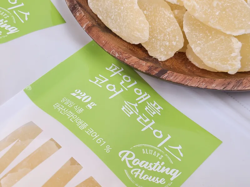 위생적으로 보관이 가능하도록 지퍼백으로 포장했어요. 언제 어디서나 들고만 다니면 달콤한 파인애플 간식을 드실 수 있습니다. 달콤하게 절여 더욱 달달한 건과일 파인애플, 과일 간식으로 정말 손색이 없어요!