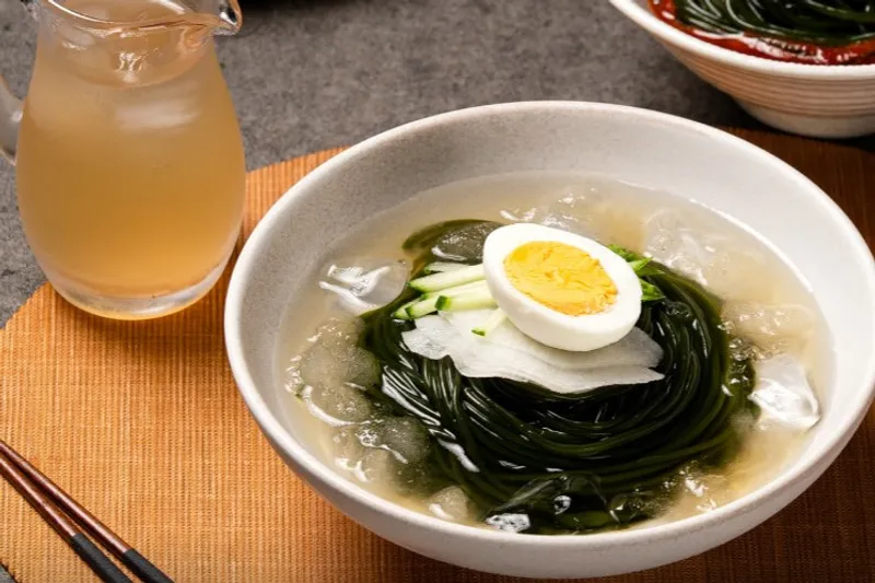 바다의 신선함과 깊이가 담긴 쫄깃쫄깃한 미역국수입니다.